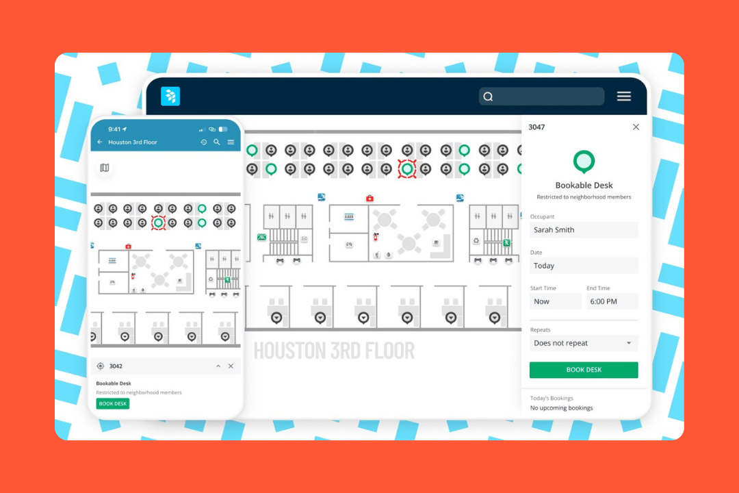 The experience is centered around interactive floor plans. You open a map, see where a teammate is sitting, and grab the spot next to them in two clicks. It integrates with Microsoft and Google Workspace and has both iOS and Android mobile apps, so employees can book their desks from their phones before they even get to the office.