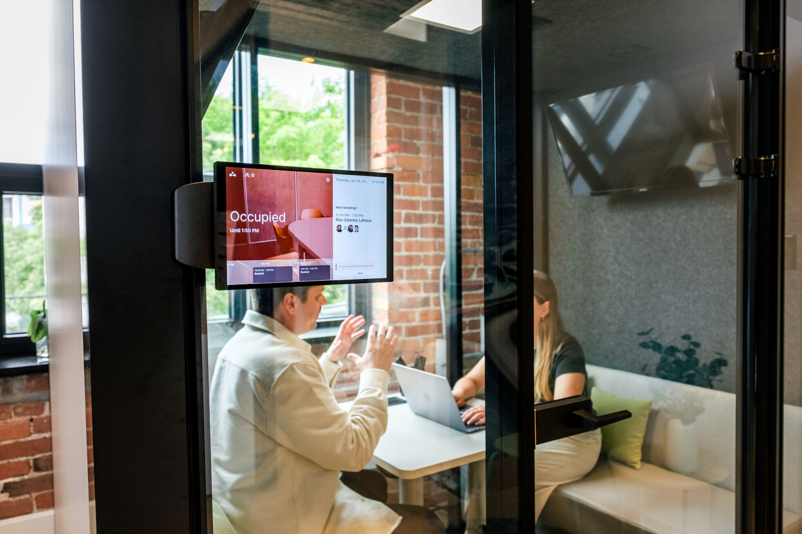 These are the screens outside the room. They show whether the room is free or taken, and users have to tap something like Start meeting when they arrive. If they don’t, the booking gets cleared. It’s more visible than an email and harder to ignore, but it still adds a small step.