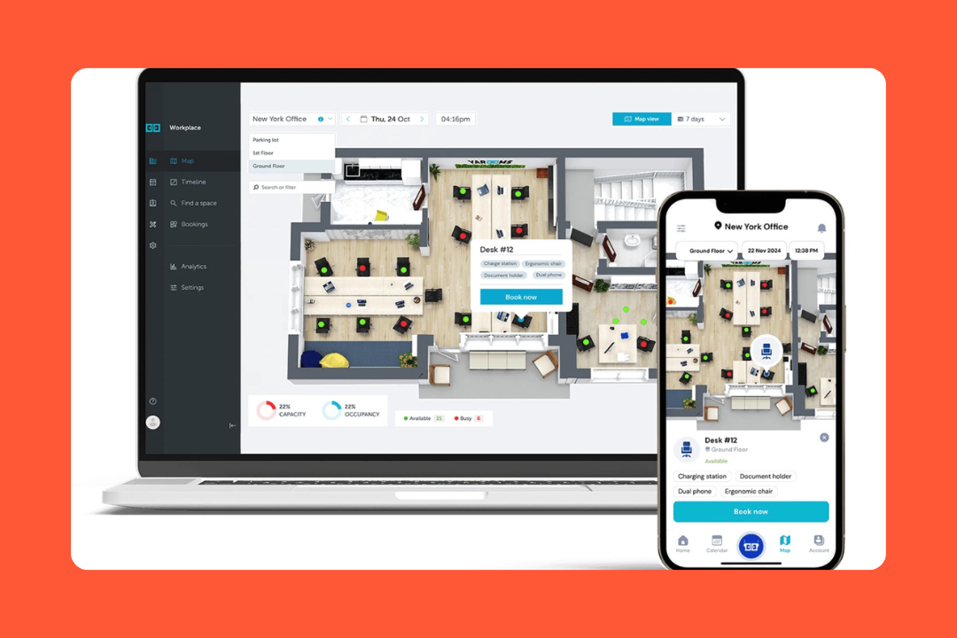 Interactive floor plans: Instead of booking from a plain list, employees can book directly from a visual map and see where they’re going.